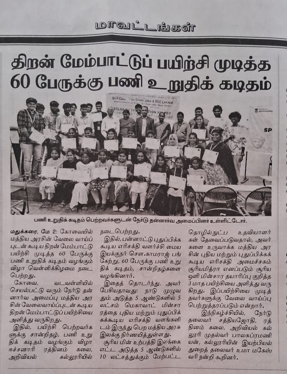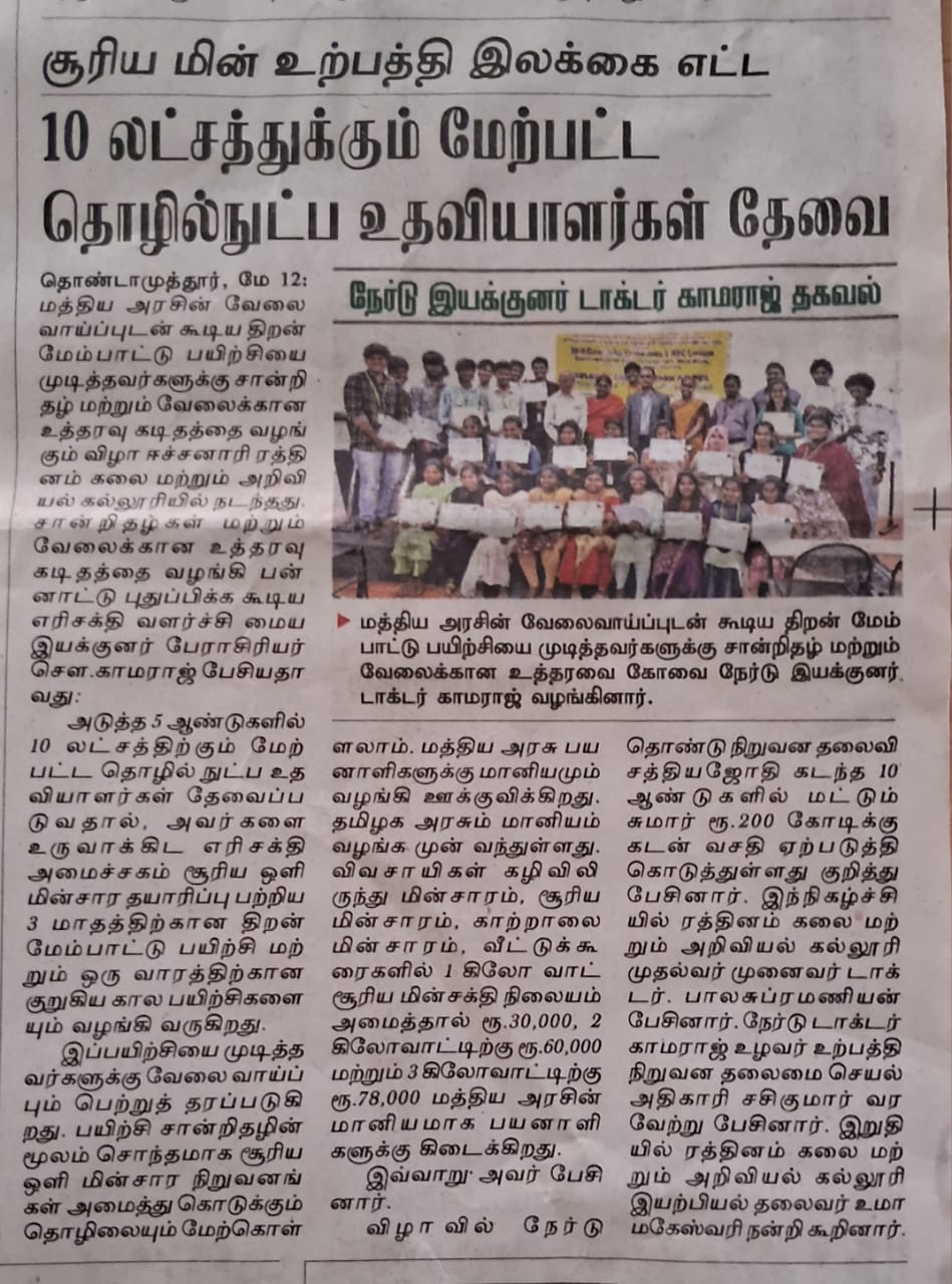 வேலைவாய்ப்புடன் கூடிய திறன் மேம்பாட்டு பயிற்சி சான்றிதழ் வழங்கும் விழா